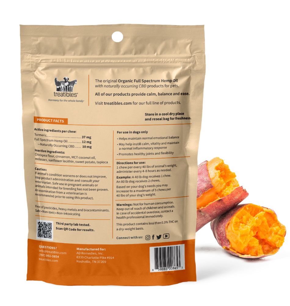 The powerful combination of 10 mg of Organic Full Spectrum Hemp CBD extract and turmeric is delivered with the sweet potato flavor dogs love.